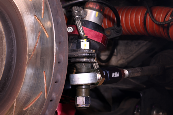 ASM S2000 1号車にも使用していたASMフロントロアアームバーGTでステアリングラックは固定されていますが、ARVOUステアリングリジットカラーを追加してステアリングラックのゴムブッシュ分の遊びも抑えることで、ASMタイロッドエンドと組み合わせることでハンドル操作時の動きが自然になります。また、無限ダンパーロアブッシュをSUPER NOWピロブッシュに変更することで、ブッシュの動きに因るダンパーロッドにかかる横力を減らしてさらにスムーズに動くようにしました。